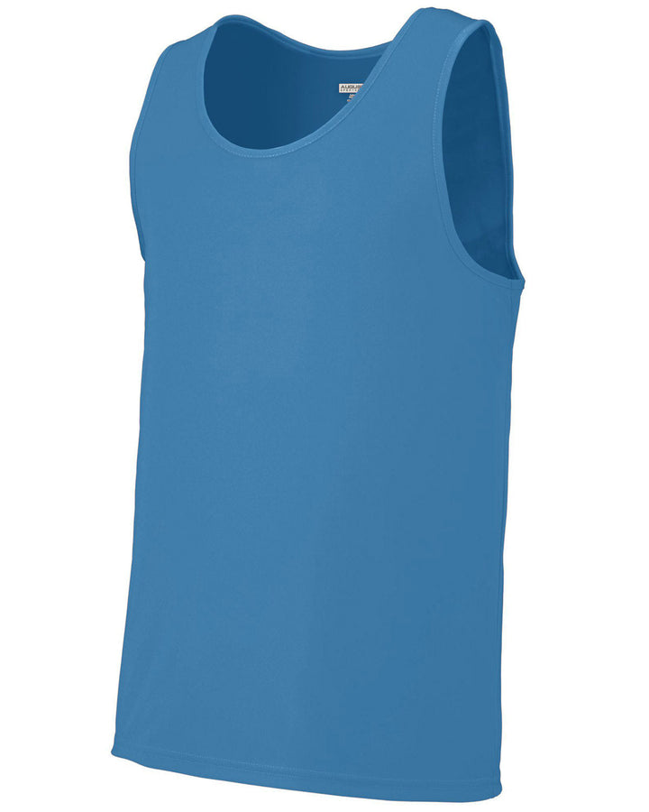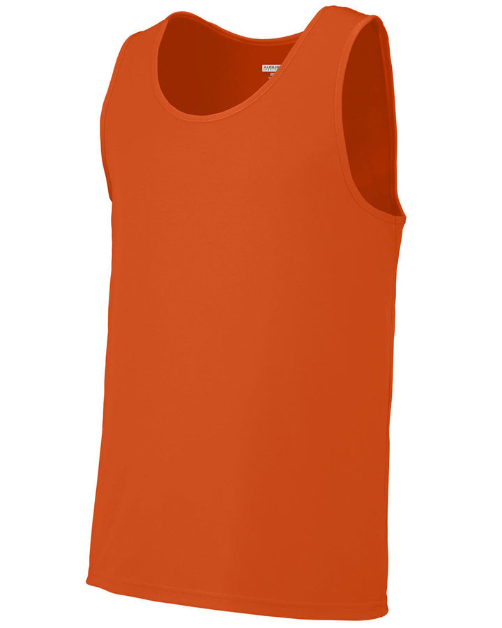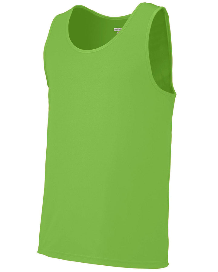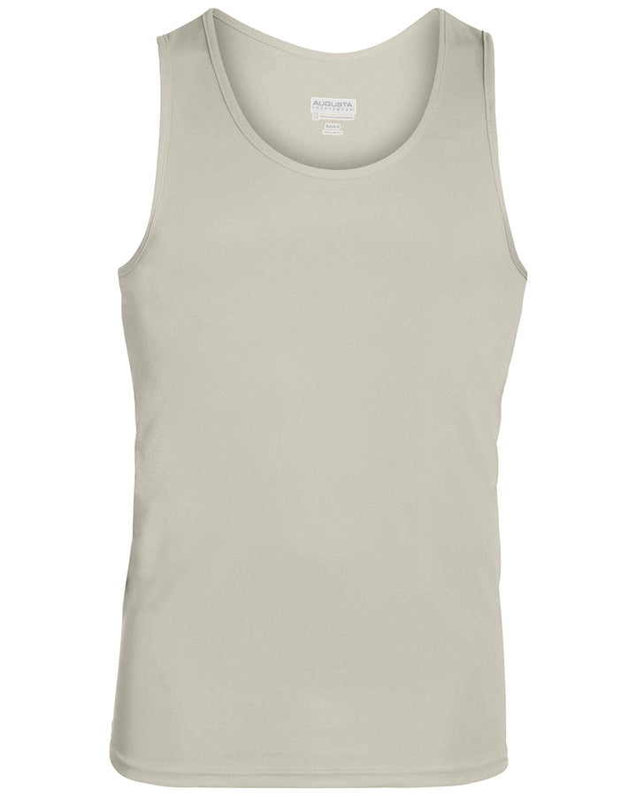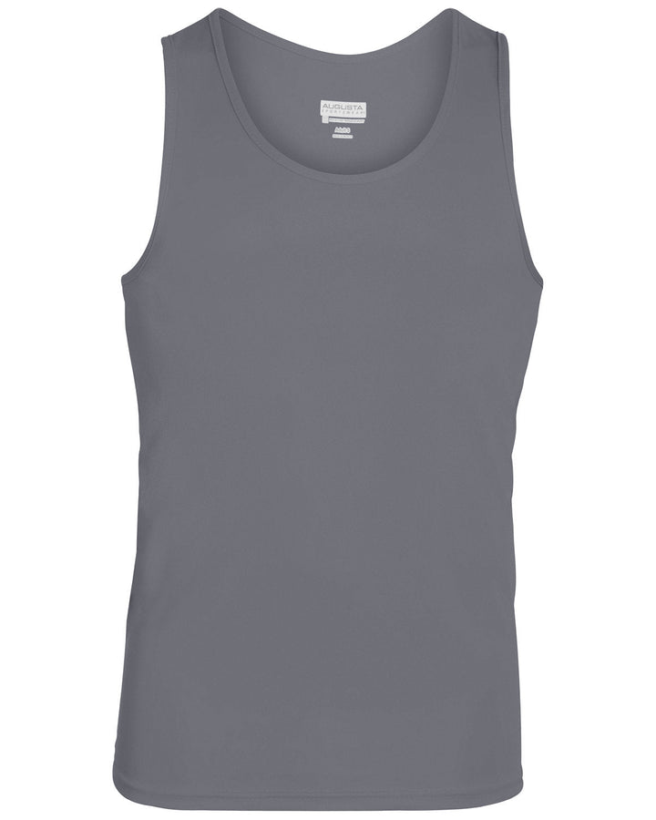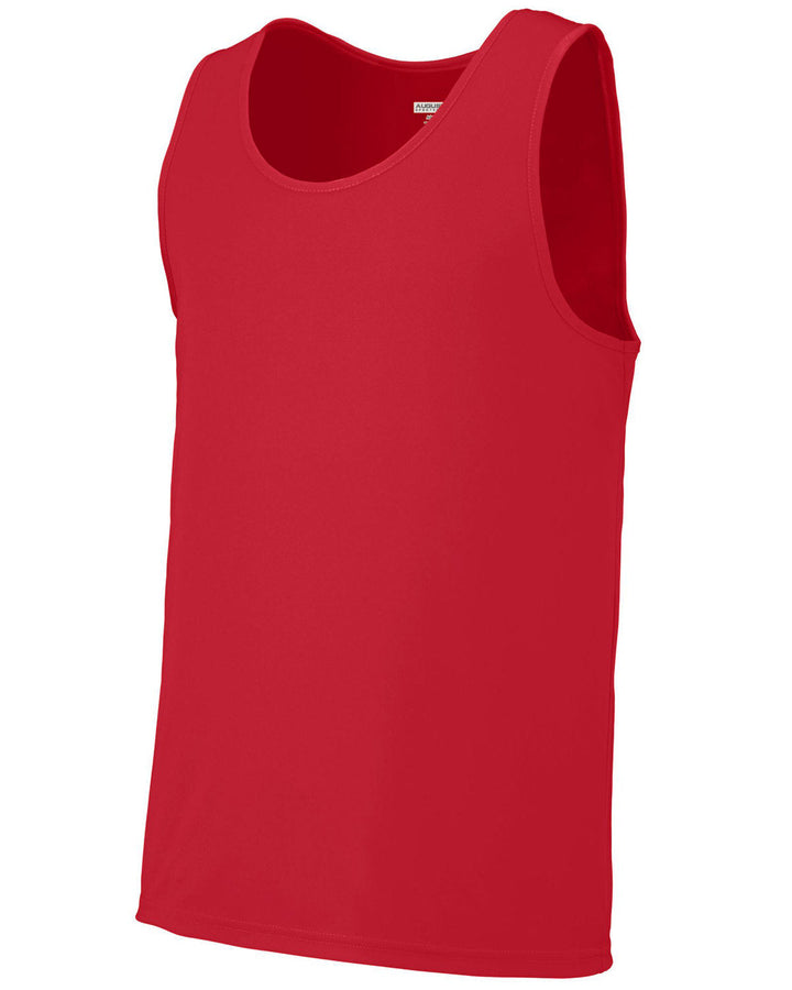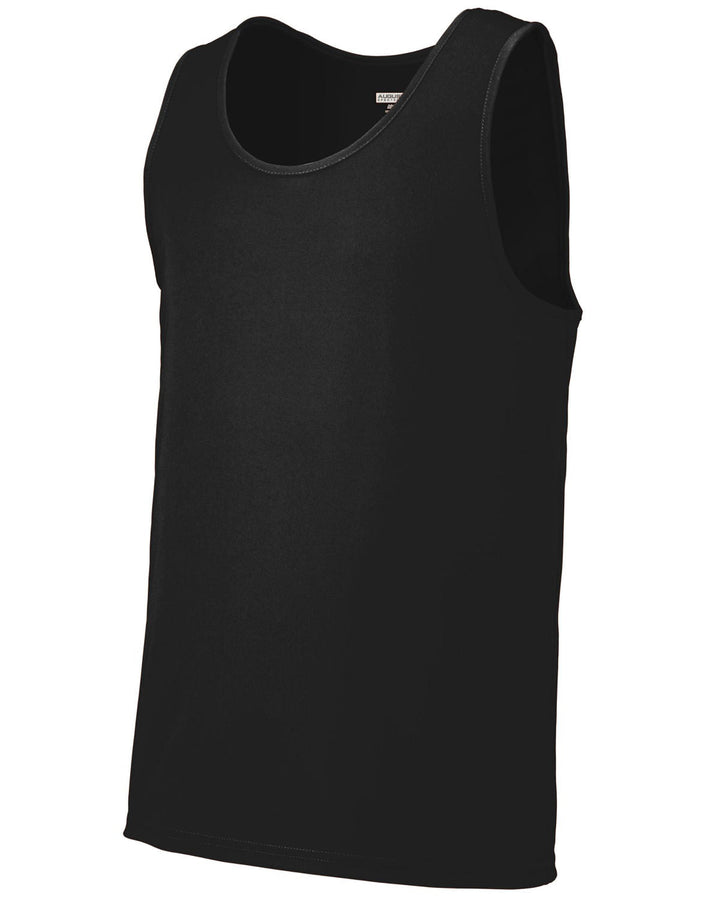 100% polyester wicking knit; Wicks moisture away from the body; Heat-seal label; Self-fabric binding at neck and armholes; Double-needle hemmed bottom